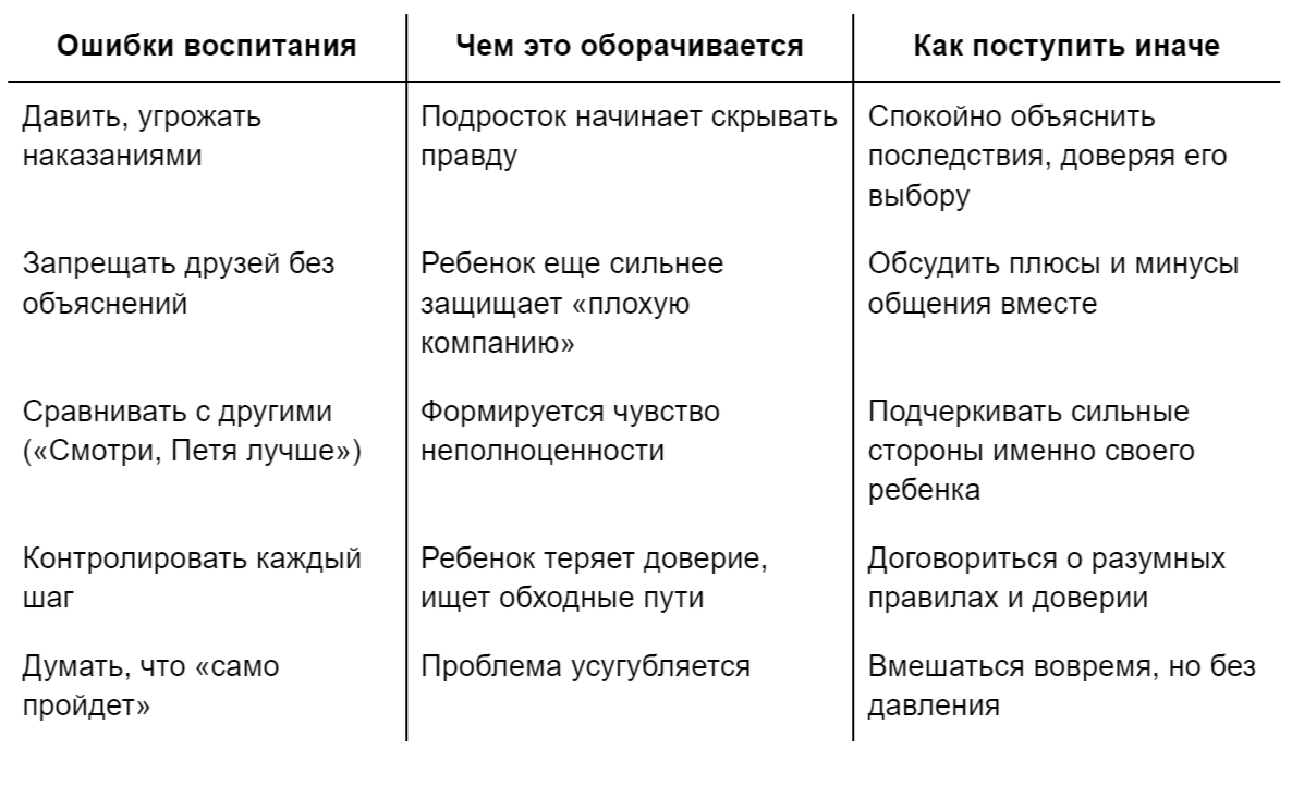 Частая ошибка: категорично запрещать старых друзей. Это почти всегда вызывает обратный эффект — протест и желание делать назло. Более мягкий и рабочий вариант — дать возможность новым знакомствам постепенно вытеснить прежнюю компанию.