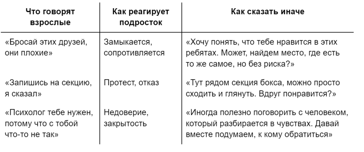 Правила для подростка — это не оковы, а ориентиры, которые помогают чувствовать безопасность. Важно не только вводить границы, но и объяснять их смысл. Например: «Мы хотим, чтобы ты возвращался домой к девяти, потому что в это время на улице чаще бывают драки и конфликты. Нам важно, чтобы ты был в безопасности».