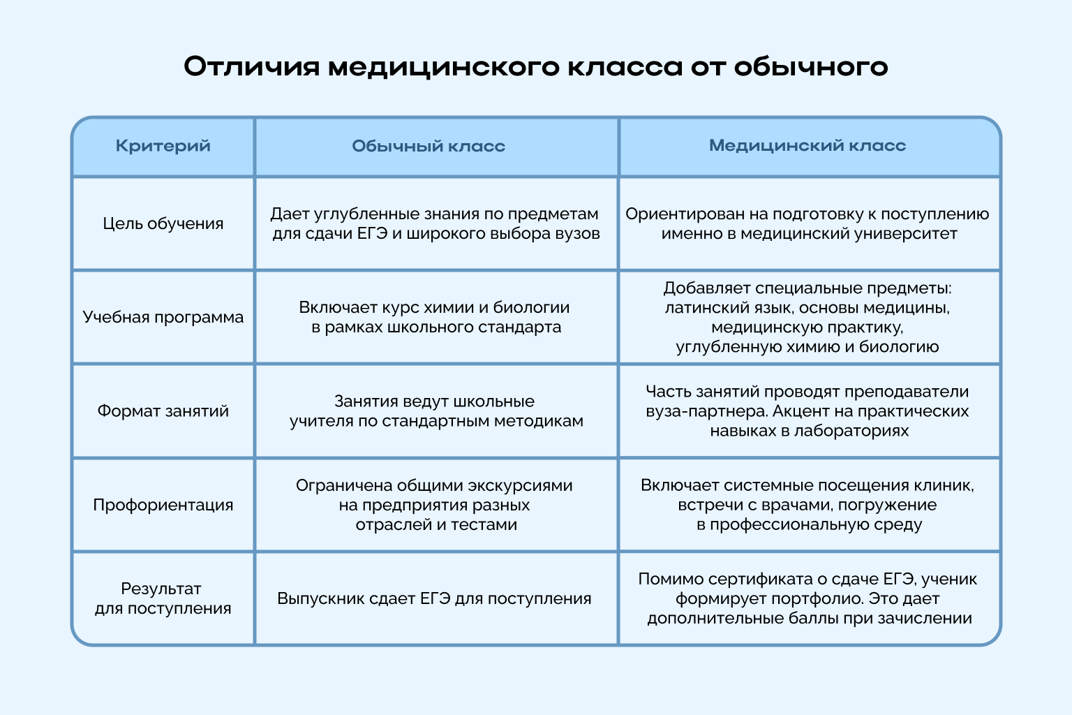 Программа медицинского класса отличается от стандартной школьной программы и даже от обычного химико-биологического профиля.