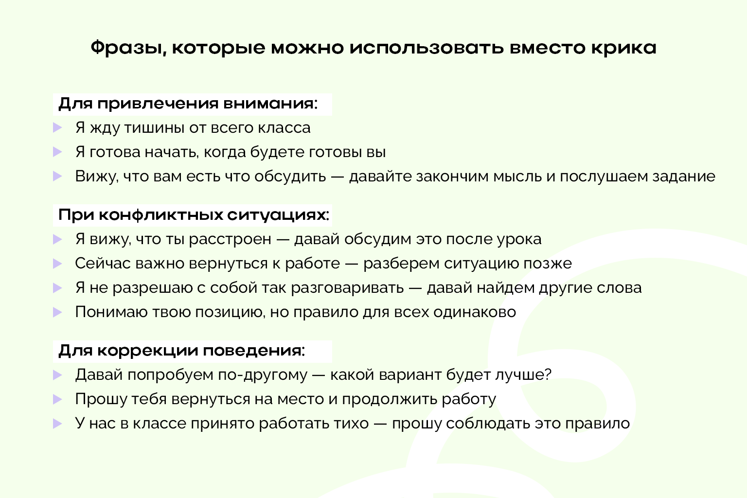 Обычно учитель повышает голос, когда перегруженной нервной системе приходится столкнуться с триггером — источником раздражения. Чаще всего это: