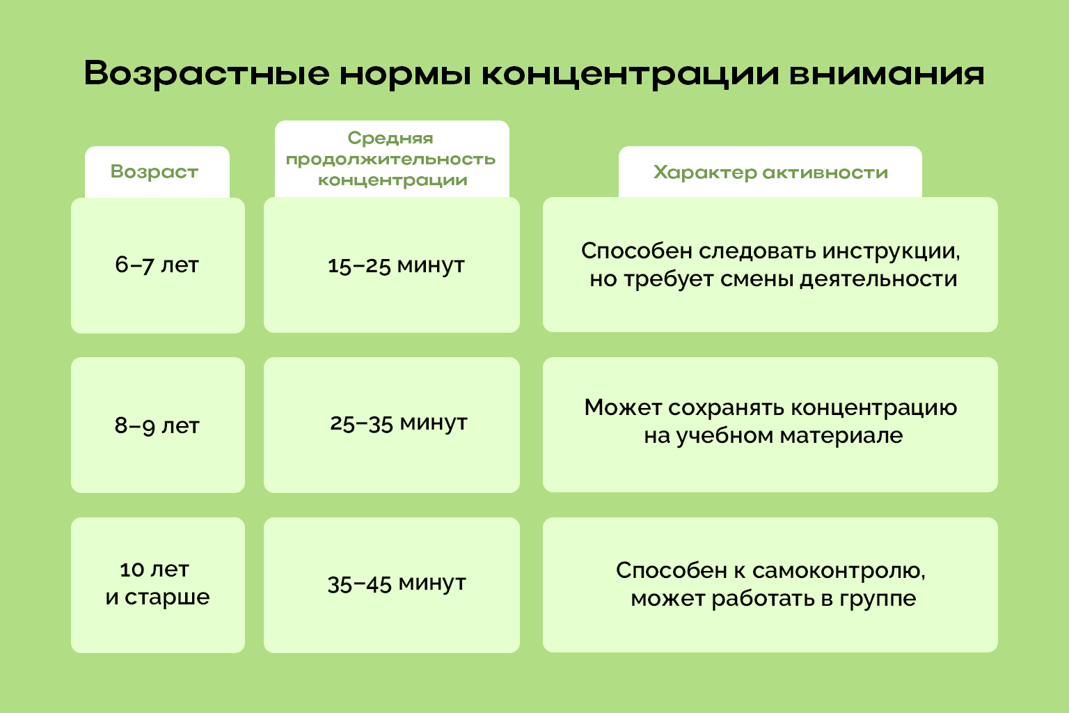 Способность концентрироваться на одном занятии зависит от возраста ребенка. Чем он старше, тем дольше может заниматься, не отвлекаясь.