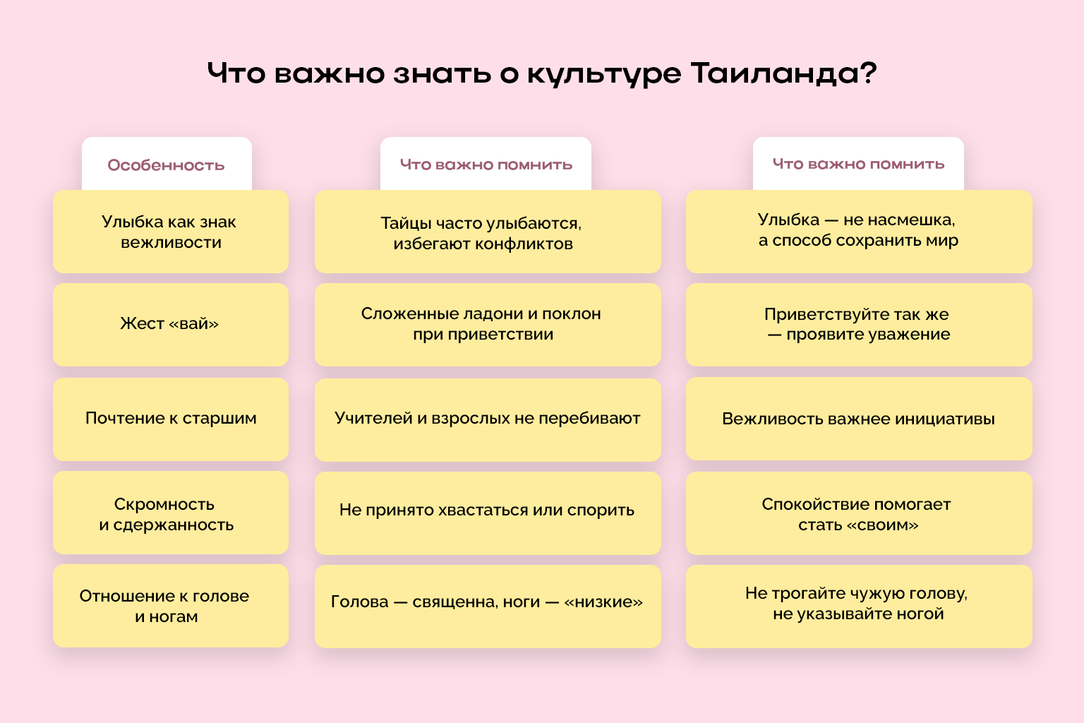 Тайцы доброжелательны, с уважением относятся к семьям с детьми и школьниками. Их культура строится на вежливости — здесь не принято повышать голос или спорить. Приветствие сопровождается легким поклоном и сложенными ладонями — жестом вай. Объясните, что улыбка здесь — форма уважения.