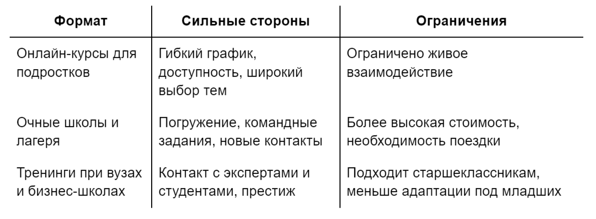 Путь подростка-предпринимателя невозможно свести к чтению книг или случайным попыткам «попробовать бизнес». Нужны структурированные знания, поданные в доступной форме. Именно курсы и тренинги помогают связать теорию с практикой: они дают системное понимание, развивают аналитическое мышление и учат работать в коллективе над реальными задачами.