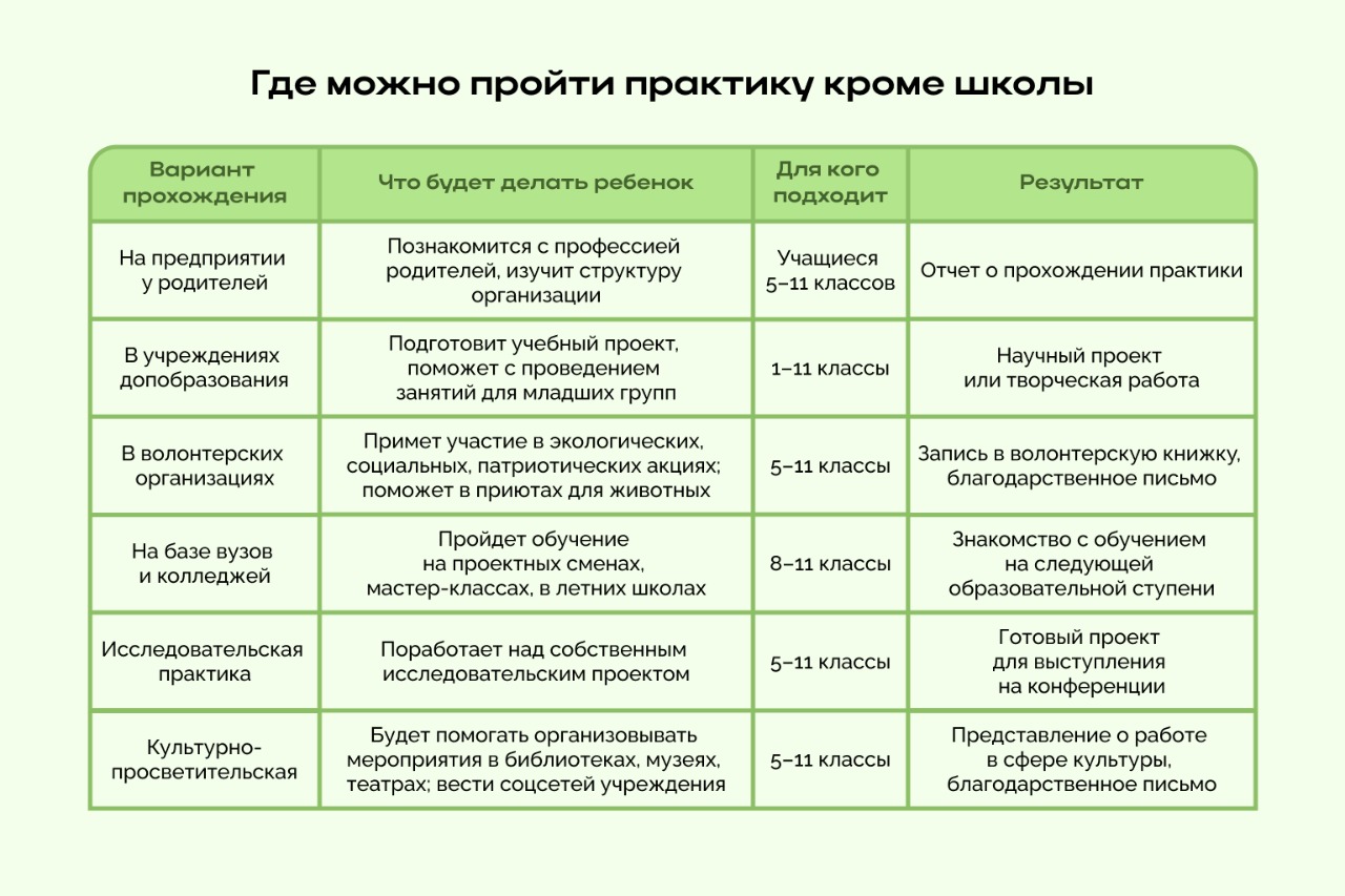 Практика считается обязательным учебным мероприятием, если она включена в учебный план и основную образовательную программу. Она должна быть бесплатной, безопасной и соответствовать возрасту учащихся.