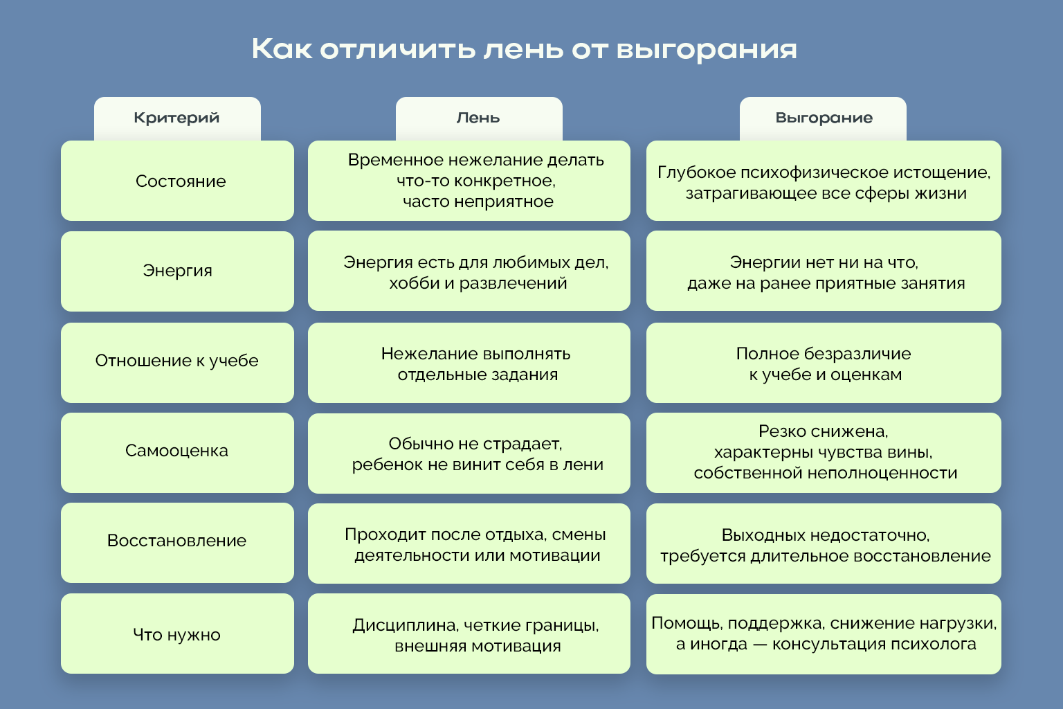Важно отличать выгорание от лени. Лень — временное нежелание делать что-то конкретное. Выгорание — это постоянное состояние, когда не хочется ничего, даже того, что раньше нравилось.