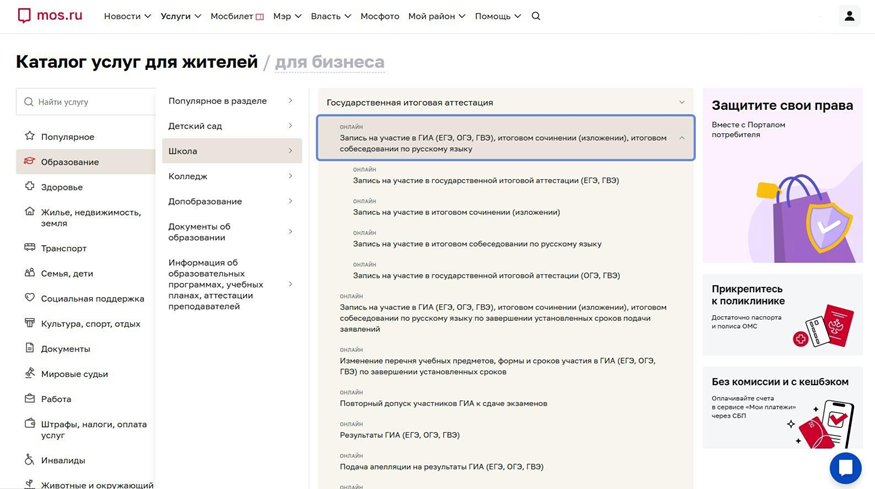 - перейдите по вкладкам «Образование» → «Школа» → «Государственная итоговая аттестация» → «Запись на участие в ГИА (ЕГЭ, ОГЭ, ГВЭ), итоговом сочинении (изложении), итоговом собеседовании по русскому языку»;