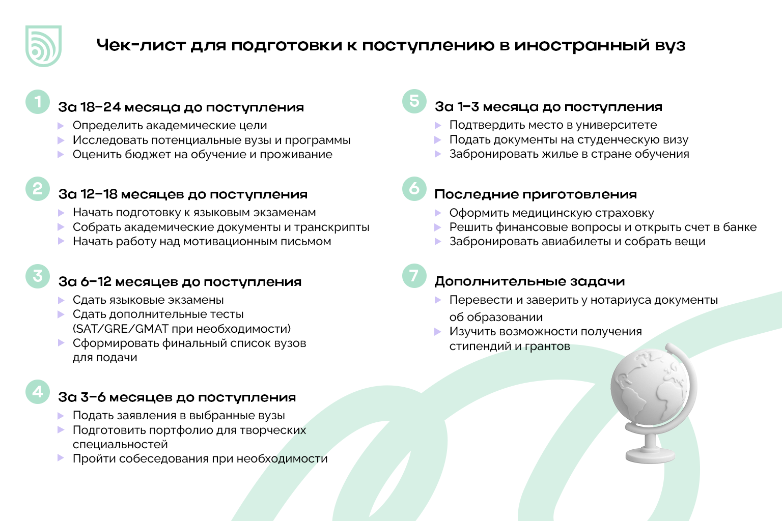 Первое, что нужно сделать при подготовке к поступлению в иностранный вуз — составить детальный план с жесткими дедлайнами. Главный приоритет — сдать языковые экзамены.