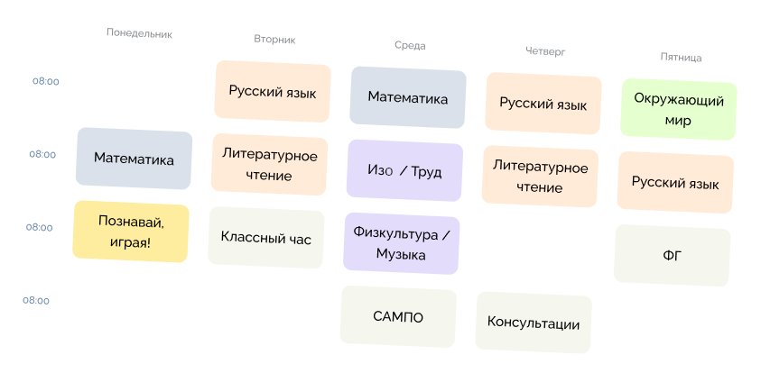 Уроки распределяются равномерно в течение недели, чтобы избежать перегрузки. Объём часов по предметам соответствует учебному плану, разработанному на основе федеральных стандартов. Предусмотрено время на выполнение домашних заданий и самостоятельную работу в цифровой образовательной среде школы «БИТ».